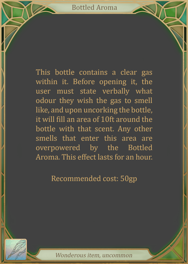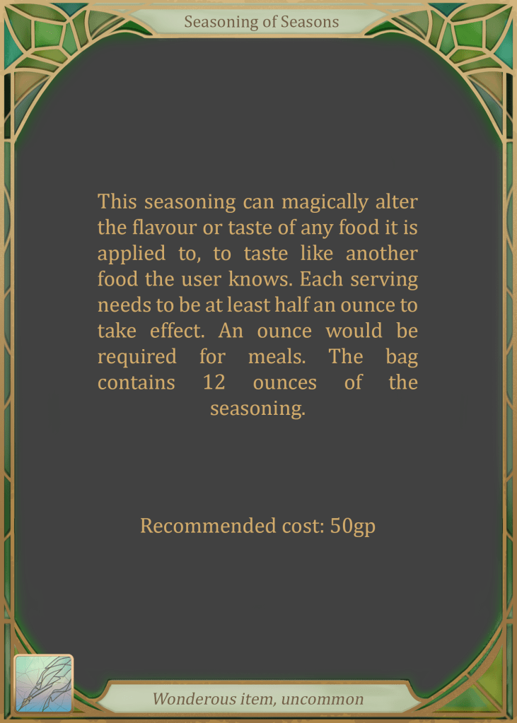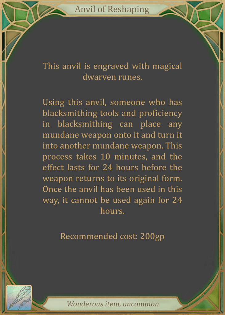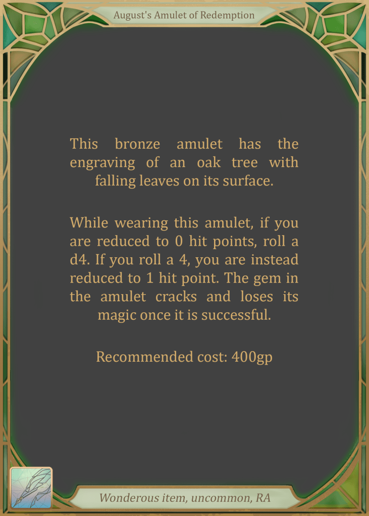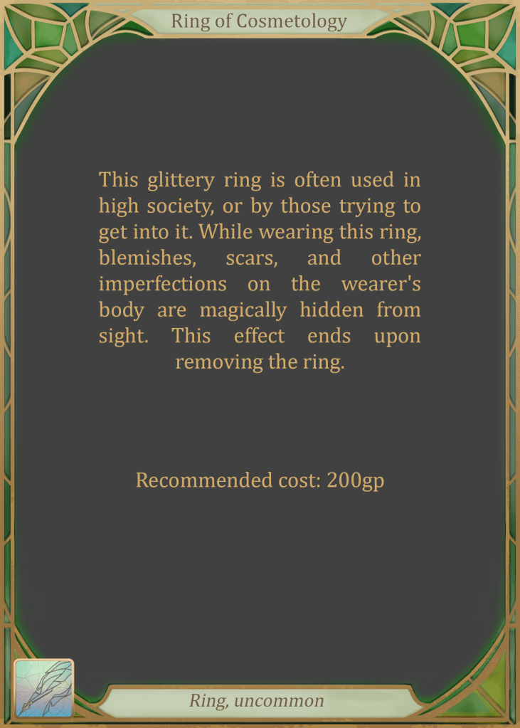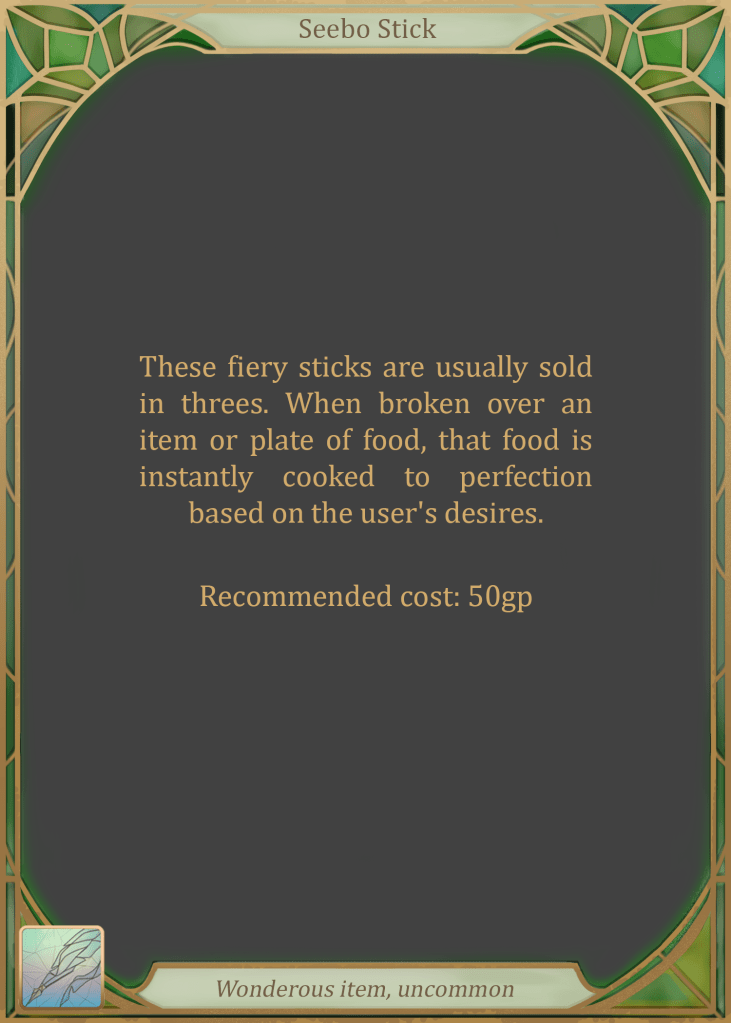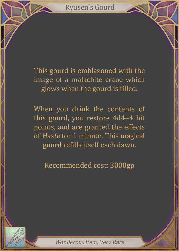 In the year 2022 I got together with a good friend of mine and we decided to spend a couple of weeks creating item cards intended to be compatible with Dungeons and Dragons 5e. The ever wonderful artist and dear friend @shanwichartist was commissioned for the art and design. At the beginning of 2023 the OGL scandal rocked the TTRPG space. Due to concerns that our continued production of these cards would lead to legal issues we decided to cut things short. As we now do not seek to profit from them it seems a shame to keep them from the public. Please enjoy these free items as you wish.